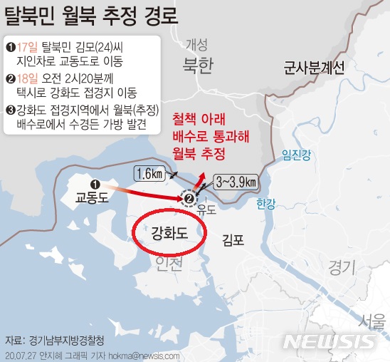 韓聯社稱,韓國軍方監視設備捕捉到金某越境行跡但卻未採取措施,預計這將引發不少爭議。綜合軍警方面調查內容推測,金某18日上午2時20分許乘坐出租車抵達位於仁川市江華邑的月串裏,趁着漲潮和落潮時間通過鐵欄下面的排水管道北上渡江返朝。