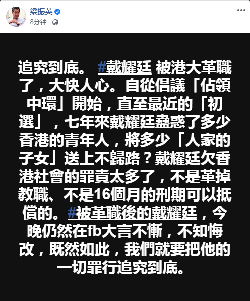 “戴耀廷被港大革職了,大快人心。自從倡議‘佔領’中環開始,直至最近的‘初選’,七年來戴耀廷蠱惑了多少香港的青年人,將多少‘人家的子女’送上不歸路?戴耀廷欠香港社會的罪責太多了,不是革掉教職、不是16個月的刑期可以抵償的。被革職後的戴耀廷,今晚仍在臉書大言不慚,不知悔改,既然如此,我們就要把他的一切罪行追究到底。”