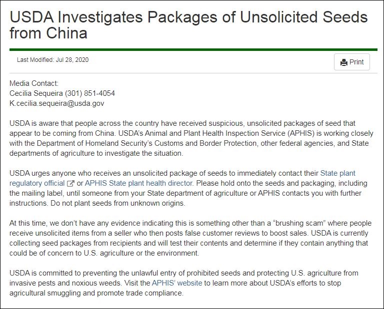 28日,美國農業部就此事正式發表了聲明。“我們已知悉,全國各地的人們都收到了可疑的、未訂購的種子包裹。這些包裝袋似乎來自中國。美國農業部動植物衞生檢驗局(APHIS)正在與國土安全部、海關和邊境保護局、其他聯邦機構以及州農業部密切合作,調查這一情況。”
