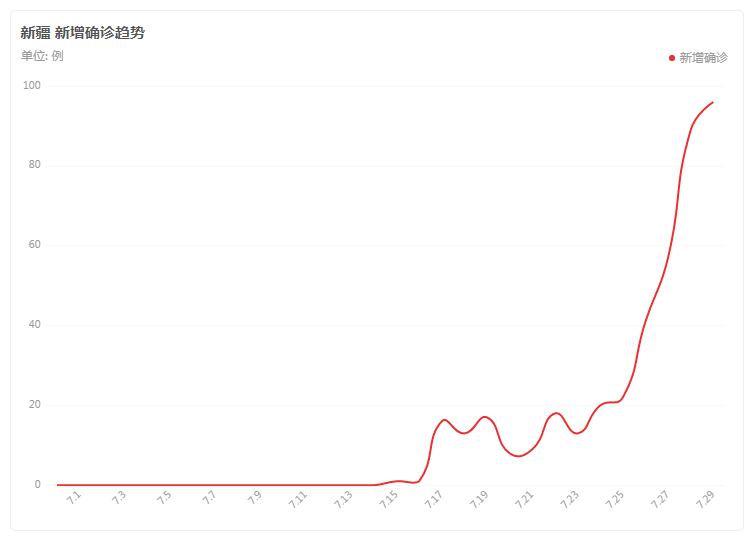 據新疆衞健委消息:新疆維吾爾自治區衞生健康委最新通報,7月29日0時至24時,新疆維吾爾自治區(含新疆生產建設兵團)報告新增新冠肺炎確診病例96例(其中8例為無症狀感染者轉確診病例),新增無症狀感染者18例,均在烏魯木齊市;新增治癒出院確診病例4例,為烏魯木齊市病例;危重症轉重症1例、重症轉普通型2例。