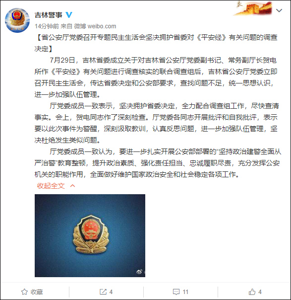 吉林省公安廳黨委表示全力配合調查《平安經》有關問題,賀電作深刻檢查
