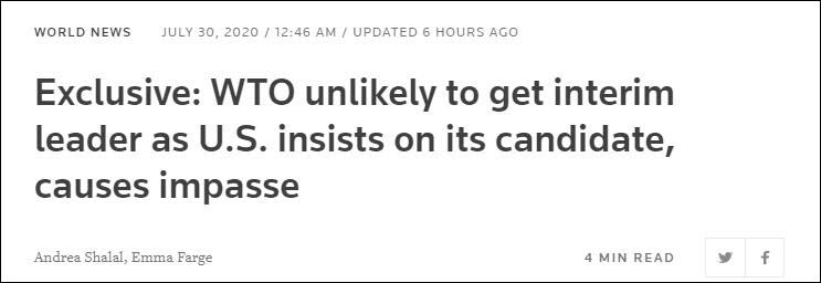 報道截圖:在美國堅持推舉其候選人導致僵局之際,世貿組織不太可能任命代理總幹事