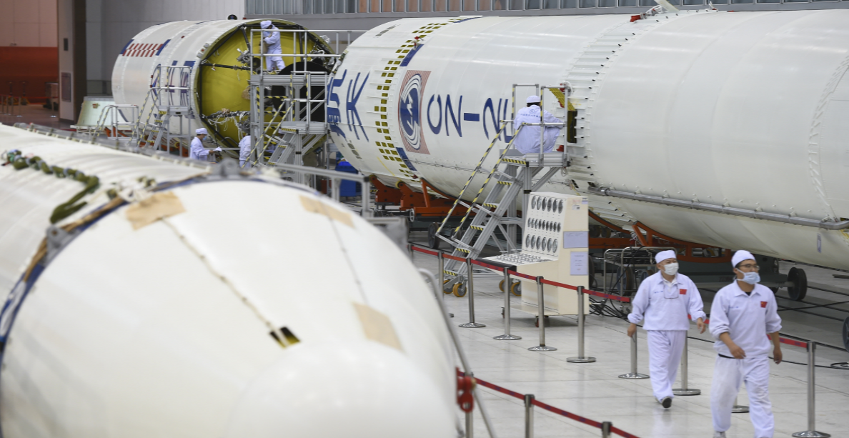 圖為執行神舟十二號飛船任務的長二F火箭總裝現場。