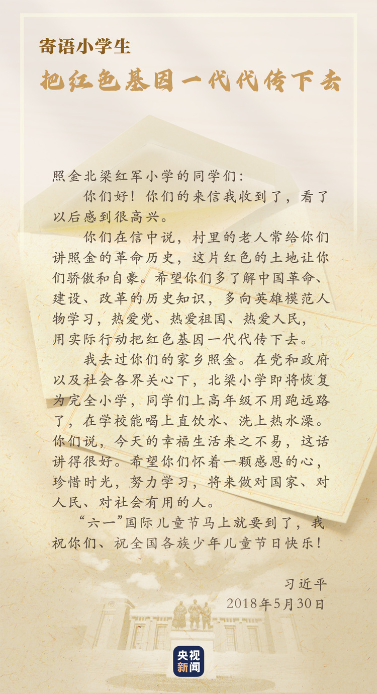 校舍變新了,師資變強了,不變的是代代相傳的紅色基因。總書記的回信,激勵着這裏的孩子傳承紅色基因,回報社會,用光熱温暖更多人,把愛傳遞出去。