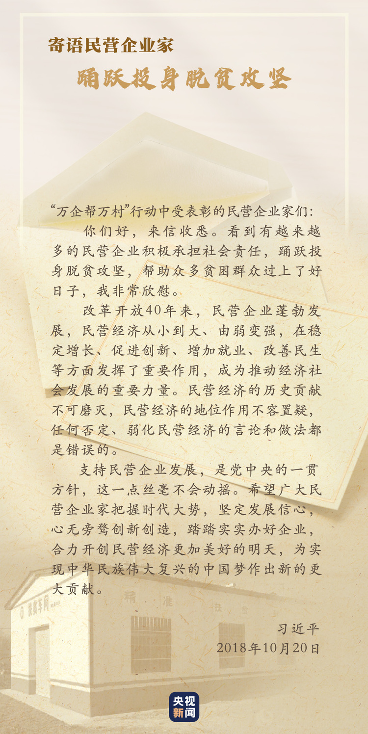 習近平對民營企業高度重視,給“萬企幫萬村”行動中受表彰的民營企業家回信,對他們踴躍投身脱貧攻堅予以肯定,勉勵廣大民營企業家堅定發展信心,踏踏實實辦好企業。
