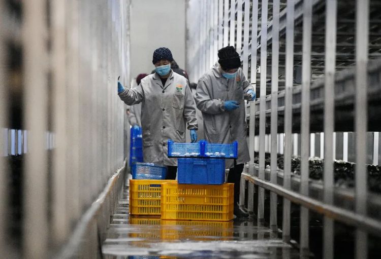 △寧夏銀川市永寧縣閩寧鎮雙孢菇栽培示範基地,農民在採摘蘑菇。