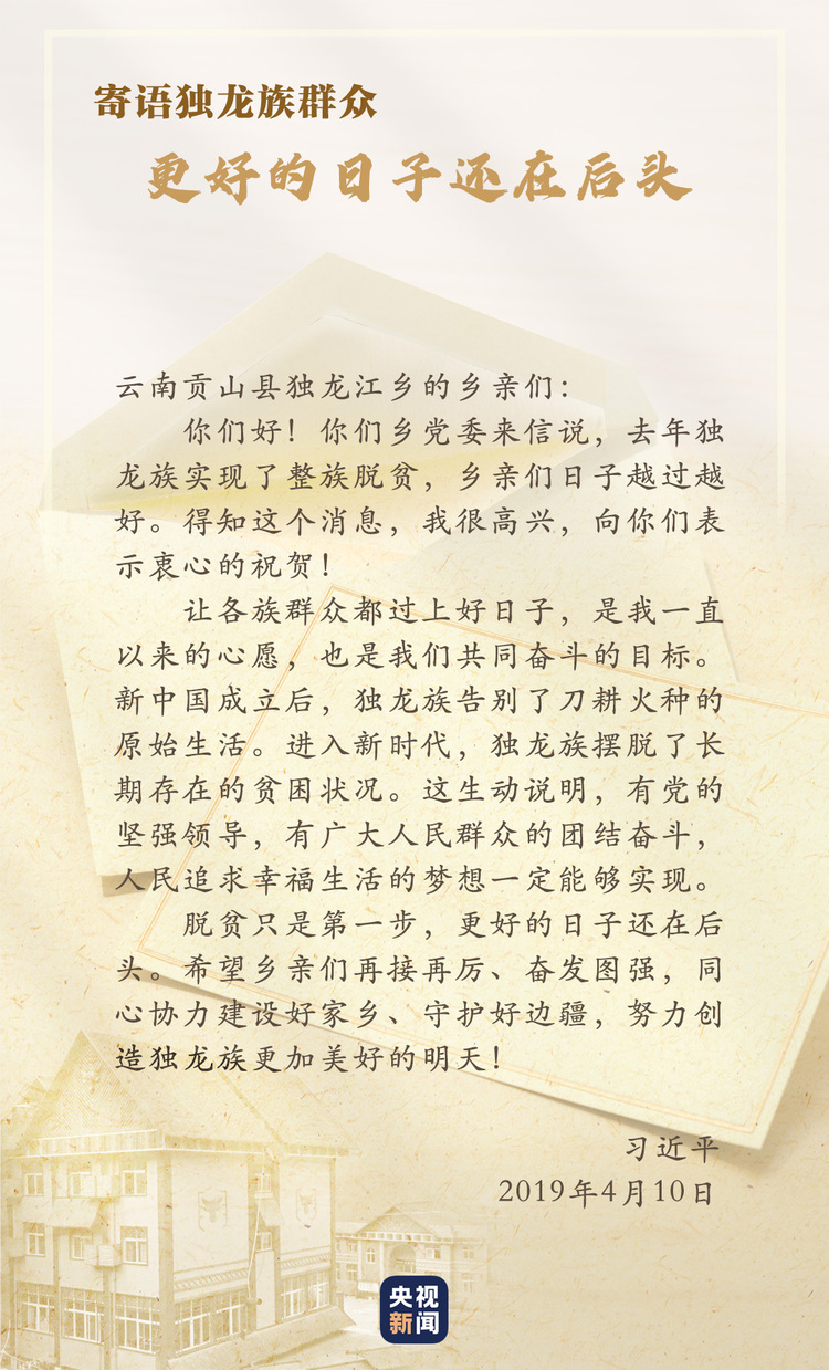 2018年,獨龍江鄉6個行政村整體脱貧,獨龍族實現整族脱貧,基礎設施、特色產業、社會事業等都發生了巨大變化。貢山縣幹部羣眾再次給習近平寫信匯報脱貧成績,習近平得知後非常高興,向他們表示“衷心的祝賀”,並勉勵鄉親們為過上更加幸福美好的生活繼續團結奮鬥。