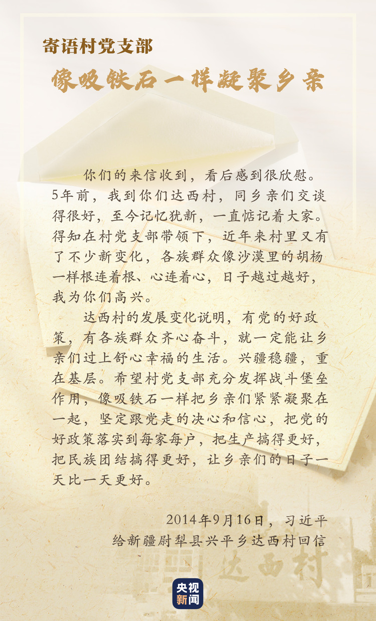 “口袋裏要鼓囊囊,精神上要亮堂堂”。2014年4月,習近平在新疆考察時講到了達西村的村訓。村民們懷着激動的心情給總書記寫信,彙報這些年村裏的積極變化。當年9月,習近平總書記給沙吾爾·芒力克和全體村民回信,強調興疆穩疆,重在基層。
