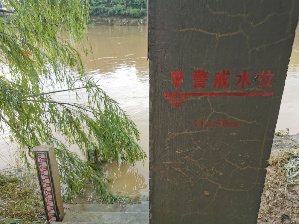 安徽省歙縣漁梁水文站的下方基礎柱上,用紅色字體標記着警戒水位(7月9日攝)。記者姜剛 攝