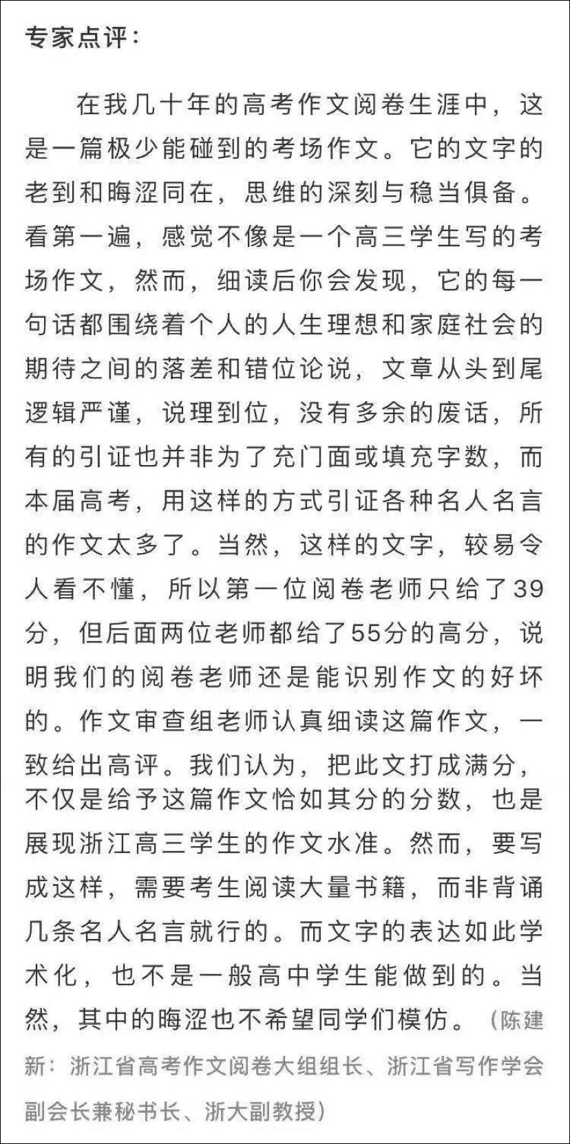 老師們給出的“答案”出入也很大,第一個老師只打了39分,第二第三個都打了55分,最終作文審查組判為滿分。