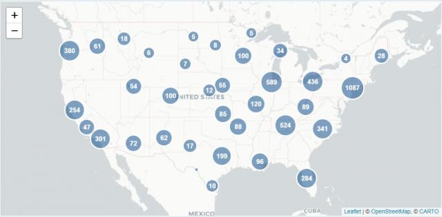 該運動波及1360個縣。美國常以縣為單位描述地區有關的數據。美國一共有3141個縣。也就是説,在7月3日為止已經有43.2%的縣出現了BLM抗議活動。Count Love[2]網站對各地方報紙關於BLM抗議事件的報道做了統計。根據該網站,在抗議最激烈的幾天曾經出現單日抗議事件達466處(5月31日)和522處(6月6日)的情況。在7月3日之後,雖然“遍地烽火”的情況大大緩解,直到本文寫作前一日,7月31日,依然在波特蘭、紐約等地有零星的抗議活動。Count Love繪製了美國全國5月25 至8月1日以來關於種族議題的抗議分佈圖(圖一)。