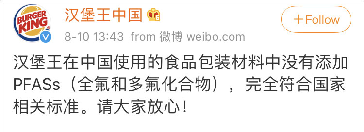 不過對於質疑,@麥當勞(金拱門中國有限公司)、@漢堡王中國 雙雙在10日表態,稱其在中國使用的食品包裝材料中沒有添加PFASs(全氟和多氟化合物),完全符合國家相關標準,請消費者放心。