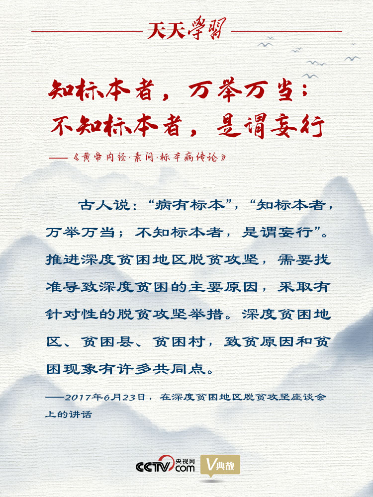 2017年6月23日,習近平總書記主持召開深度貧困地區脱貧攻堅座談會並發表重要講話。他在講話中引用古語“病有標本”“知標本者,萬舉萬當;不知標本者,是謂妄行”,指出深度貧困地區、貧困縣、貧困村,致貧原因和貧困現象有許多共同點。推進深度貧困地區脱貧攻堅,需要找準導致深度貧困的主要原因,採取有針對性的脱貧攻堅舉措。