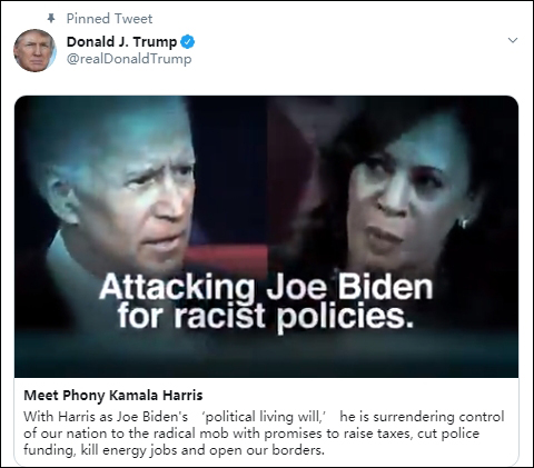 週二晚上,美國總統特朗普也在推特上置頂一條30秒視頻,專門回應拜登的提名。視頻諷刺兩人是“遲緩喬”、“虛偽哈里斯”,還攻擊哈里斯是拜登“活生生的政治遺願”,並放出她在辯論台上指責拜登以及宣佈退選時的畫面。視頻最後稱拜登有意“讓哈里斯執掌大權”,兩人“共同擁抱民主黨內的激進左翼”。