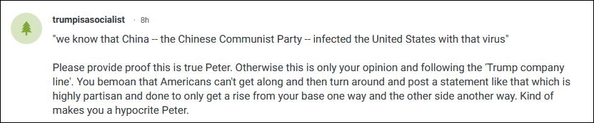 “(你説)‘中國用這種病毒感染了美國’。請你提供證據,證明這是真的。不然這是你個人的觀點,且依附於‘特朗普集團’的論調。你感慨美國人之間無法好好相處,然後轉身發表這樣帶有極度偏見的言論。這樣你看上去有點像偽君子。”