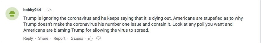 “特朗普一直在忽視病毒,也一直在説病毒會消失。美國人都很驚訝,為什麼特朗普不把新冠疫情當成他的頭號問題,並(採取措施)遏制病毒。看看任何你想看的民調,美國人都在責怪特朗普讓病毒傳播。”