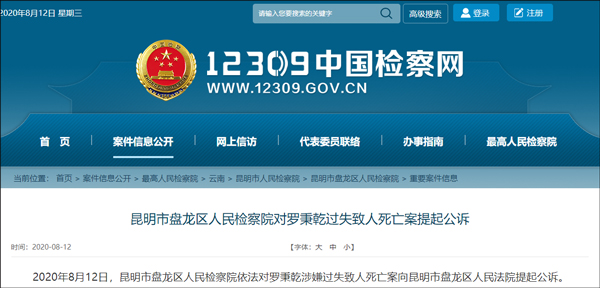 李心草溺亡案嫌疑人羅秉乾涉嫌過失致人死亡被提起公訴 None 2020-08-12 昆明女大學生李心草溺亡案嫌疑人羅秉乾涉嫌過失致人死亡,今天被昆明市盤龍區人民檢察院依法向昆明市盤龍區人民法院提起公訴。