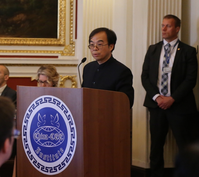 在匈牙利科學院主持“中國-中東歐研究院”成立暨揭牌儀式的黃平 圖自中國-中東歐研究院