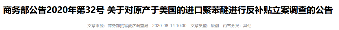 商務部網站8月14日發佈2020年第32號公告,對原產於美國的進口聚苯醚進行反補貼立案調查,本次調查確定的補貼調查期為2019年1月1日至2019年12月31日,產業損害調查期為2017年1月1日至2019年12月31日。