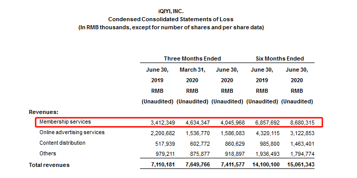 截止第二季度末,愛奇藝的訂閲會員規模達到1.05億。受惠於平台熱播劇《隱秘的角落》和綜藝《青春有你》第二季熱播,二季度愛奇藝來自會員服務的收入為40億元人民幣(約合5.727億美元),佔總營收一半以上,較去年同期增長19%。愛奇藝將增長解釋為訂閲會員數量的增長和公司提升會員業務貨幣化的多種運營措施的推動。