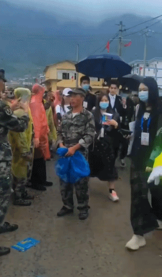視頻顯示,現場當時還在下雨,周圍羣眾身着雨衣,吳亦凡的安保人員在護送其行走時,一位黑衣男子推開了一位身穿迷彩服的男士,有網友懷疑,被推開的人是“抗洪戰士”。