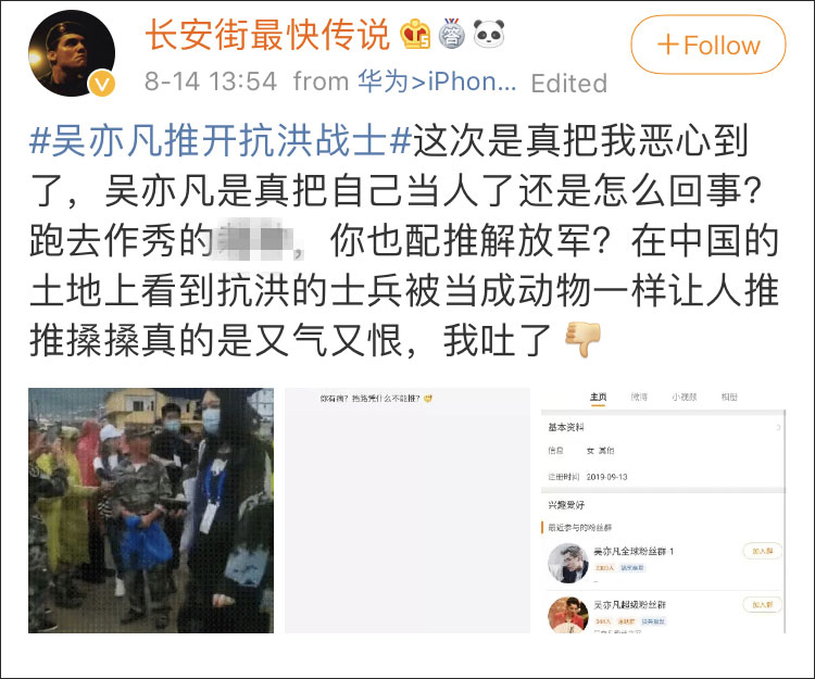 隨後,“吳亦凡推開抗洪戰士”的傳言開始發酵,有網友就此言論批評藝人及保安“沒有敬畏之心”,且不管被推者身份如何,推人的行為都不禮貌。