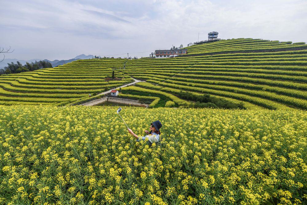 遊客在浙江省杭州市富陽區新登鎮上旺村黑山頂的油菜花海遊玩(3 月 25 日攝)。新華社記者 徐昱 攝