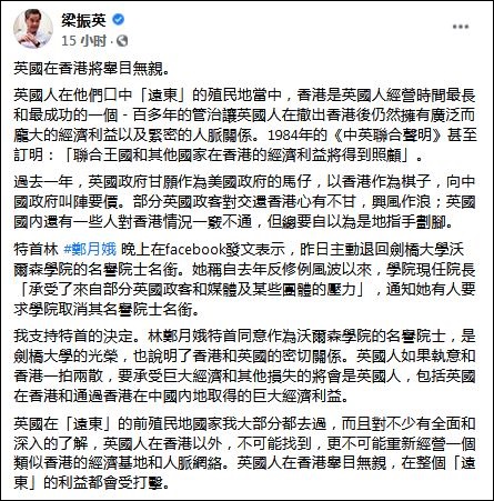 香港前特首梁振英則於15日深夜發文,力挺林鄭月娥的決定:林鄭月娥同意作為沃爾森學院的名譽院士,是劍橋大學的光榮。但英國人如果執意和香港一拍兩散,要承受巨大經濟和其他損失的將會是英國人。