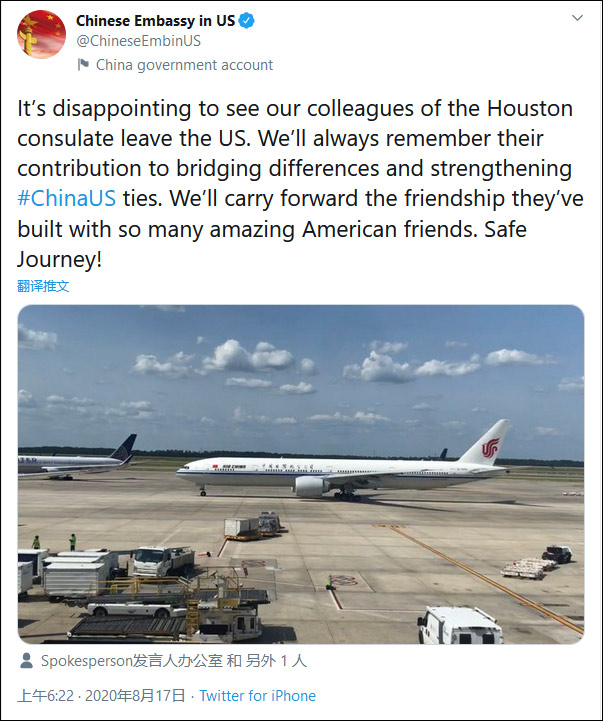 (觀察者網訊)在美國悍然挑起事端,突然要求中方關閉駐休斯頓總領館後,當地時間8月16日,中國駐美國大使館官方賬號發佈推文稱,駐休斯敦領館的中方人員離開美國,祝福他們一路平安。