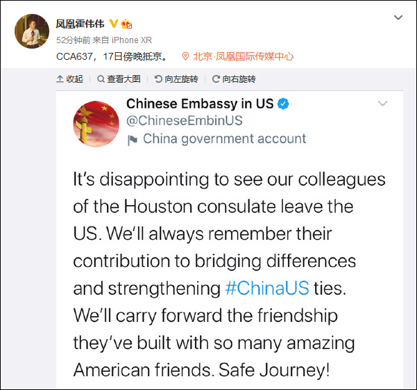 鳳凰衞視記者@鳳凰霍偉偉 微博透露,上述駐休斯敦領館的中方人員乘坐國航CA637航班,將於17日傍晚抵京。