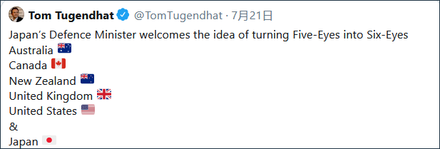 今年7月,河野太郎在出席英國所謂“中國研究小組”研討會時曾提出建議,讓日本加入“五眼聯盟”,隨後英國外交事務委員會主席湯姆·圖根德哈特(Tom Tugendhat)對此表示歡迎。