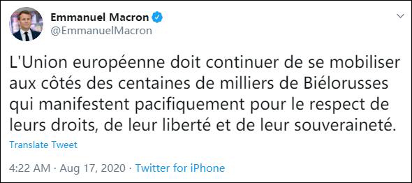 法國總統馬克龍立即對抗議者表達“支持”,他在17日發推稱,“歐盟必須繼續站在數十萬白俄羅斯人這邊,他們和平示威,要求他們的權利、自由和主權得到尊重。”