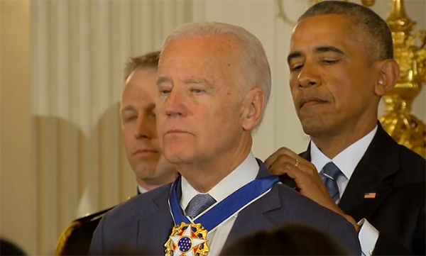 2017年1月奧巴馬卸任前授予時任副總統拜登“總統自由勳章”,視頻截圖