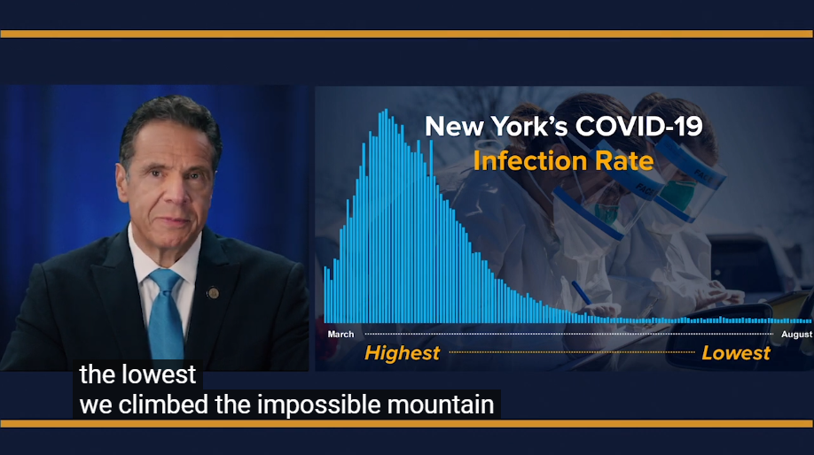 科莫首先介紹,過去6個月以來,美國曾經的疫情“震中”紐約州目前已經壓平感染曲線,“翻過了不可能的大山”。他形容這是一段“地獄般的經歷”,並向所有伸出援手的志願者表示感謝。