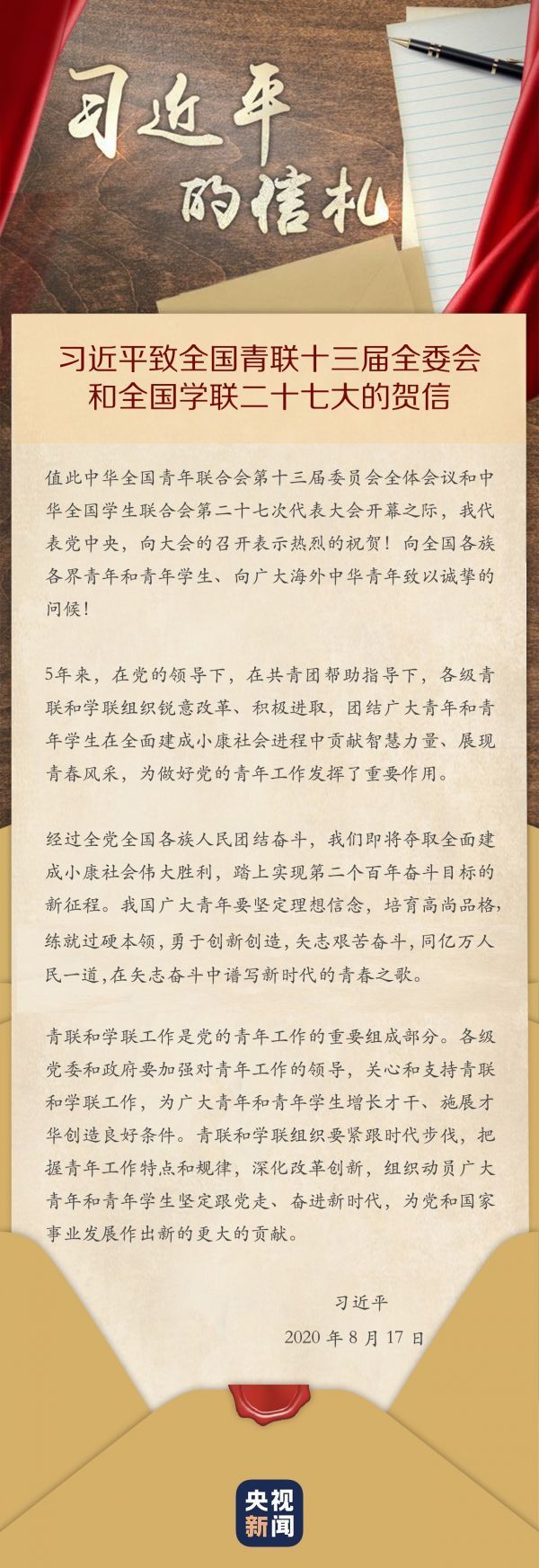 中華全國青年聯合會第十三屆委員會全體會議、中華全國學生聯合會第二十七次代表大會8月17日在北京開幕。習近平總書記發來賀信,代表黨中央,向大會的召開表示熱烈的祝賀,向全國各族各界青年和青年學生、向廣大海外中華青年致以誠摯的問候。