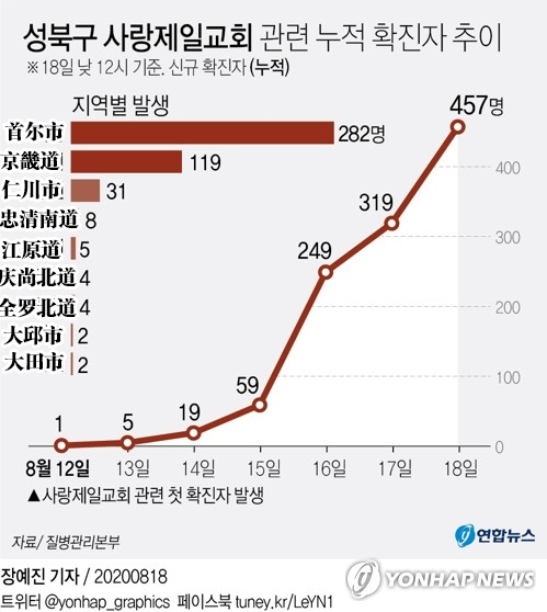 疾病管理本部在分析了3436名教徒名單後發現,該教會教徒遍佈全韓,其中有2993人集中在首都圈,其他的市、道大多都分佈着20人以上的教徒。該教會還在8月8日和8月15日在首都圈組織了兩場全國教徒的集會,有分析認為,二次傳染的迅速擴散可能同這兩場集會有關。