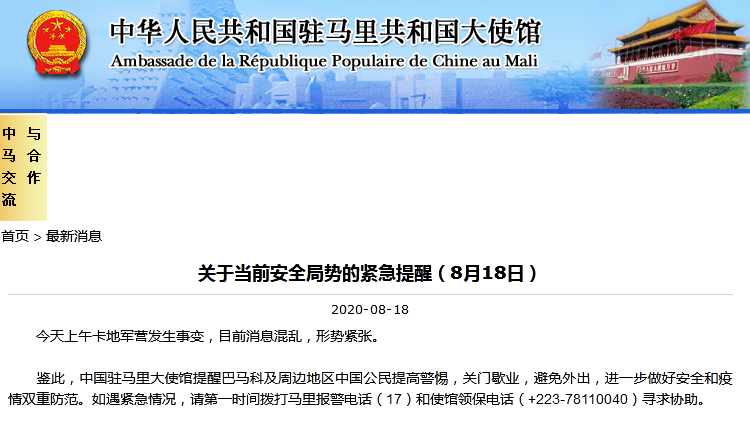 據中國駐馬裏大使館網站8月18日消息,今天(18日)上午卡地軍營發生事變,目前消息混亂,形勢緊張。