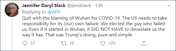 “不要再因為新冠病毒責備武漢了。美國需要為它(我們)自己的失敗負責**。**我們選舉出了一位仁兄,但他辜負了我們。即使這疫情在武漢暴發,它本不該像現在這樣把美國都摧殘壞了。這是特朗普造成的,多麼簡單的道理。”