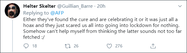 更有甚者,陷入了“武漢陰謀論”中——“他們要麼是在慶祝找到了治療方法,要麼這就是個大騙局,他們把我們嚇得都不敢出門了,然而我們隔離一點意義也沒有。我覺得第二種猜測不是特別離譜。”