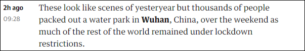 該社記者瑞秋·布朗迪(Rachel Blundy)在推特上感嘆“2020真是奇幻的一年……武漢都開派對了。病毒?啥病毒?”