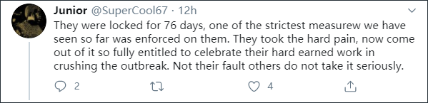 “他們封鎖了76天,這是我們見過的最嚴格的措施之一。他們經歷了巨大的痛苦,現在他們走出來了,所以完全有資格去慶祝來之不易的勝利。(疫情)不是他們的錯,不要去槓他們。”有評論稱。