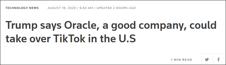 在月初特朗普下達了限期45天的“交易禁令”之後,TikTok積極為自身尋找後路。微軟已和字節跳動進行了數週的談判,被認為是最有可能與TikTok達成交易的公司。而這次甲骨文加入競購,將為字節跳動提供了除微軟外的另一個可靠選擇。