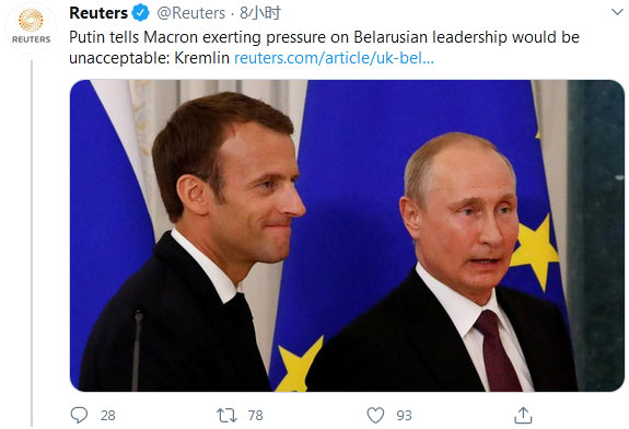 據路透社最新消息,普京警告馬克龍,對白俄羅斯領導層施壓是“不可接受”的,圖片來源:推特截圖