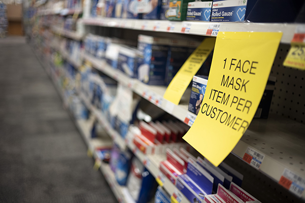 3月7日,美國紐約曼哈頓一家藥店內貼着口罩限量銷售的告示。圖自新華社。