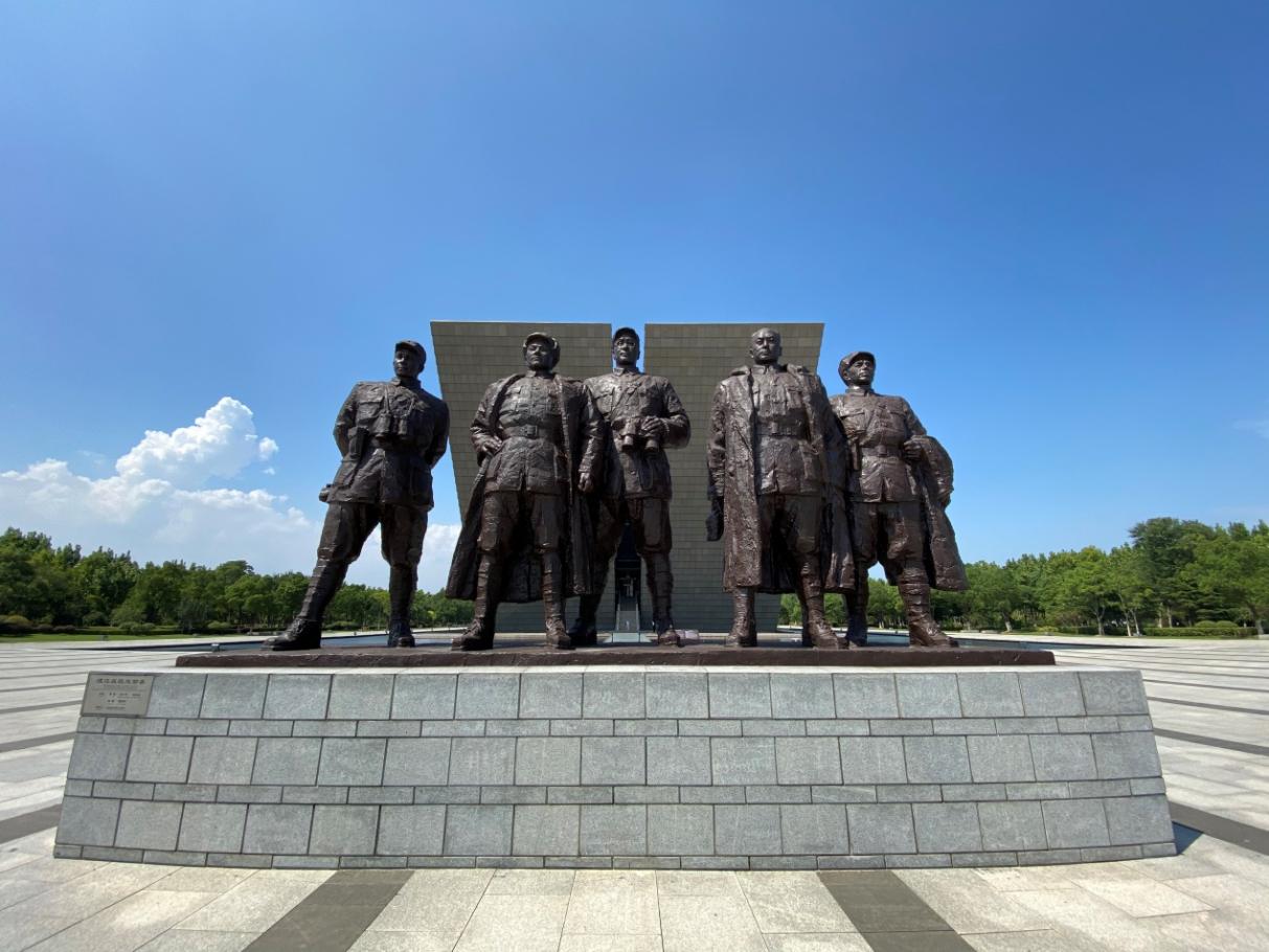 △如今,總前委銅製羣雕矗立在紀念館南側。(總枱央視記者彭漢明拍攝)