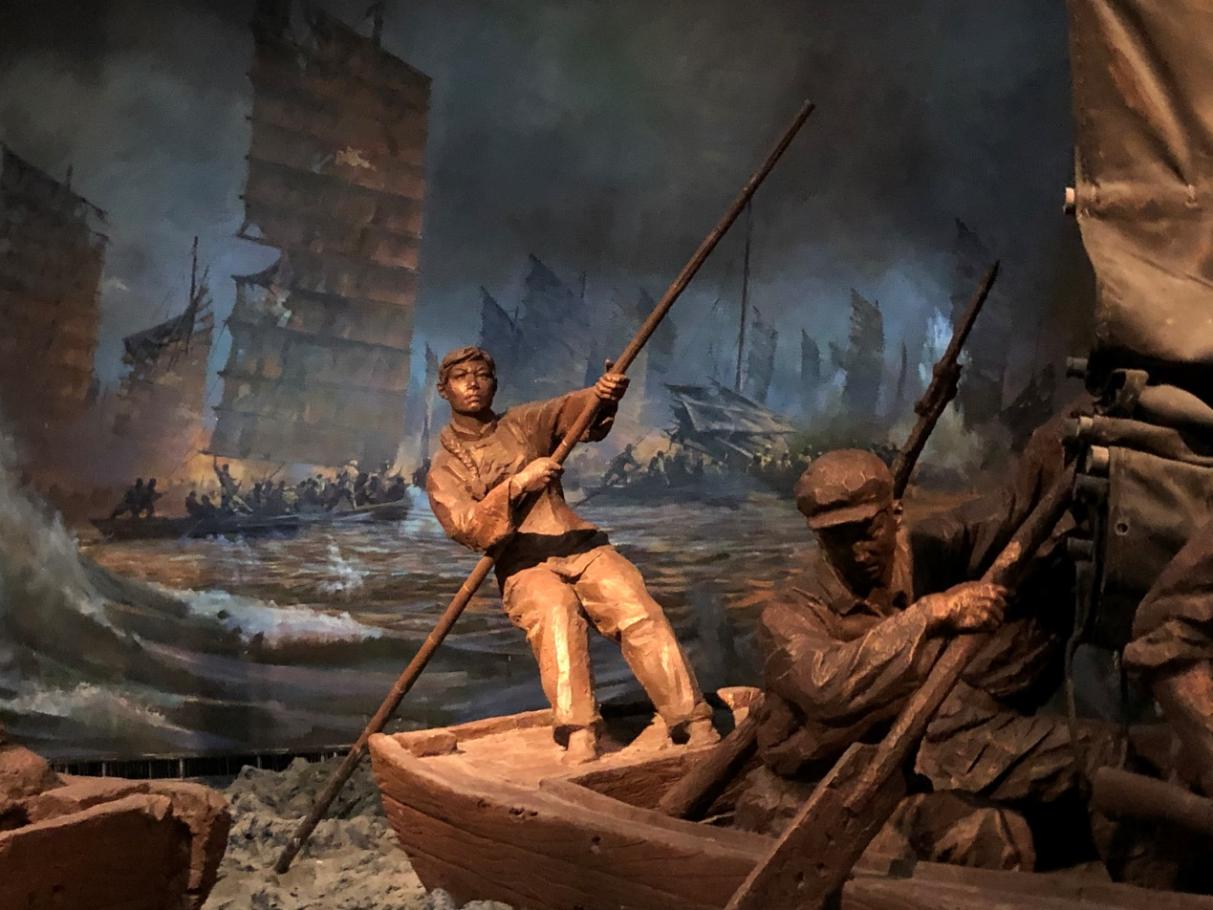 △馬毛姐送軍過大江的雕塑陳列於渡江紀念館內(總枱央視記者許永松拍攝)
