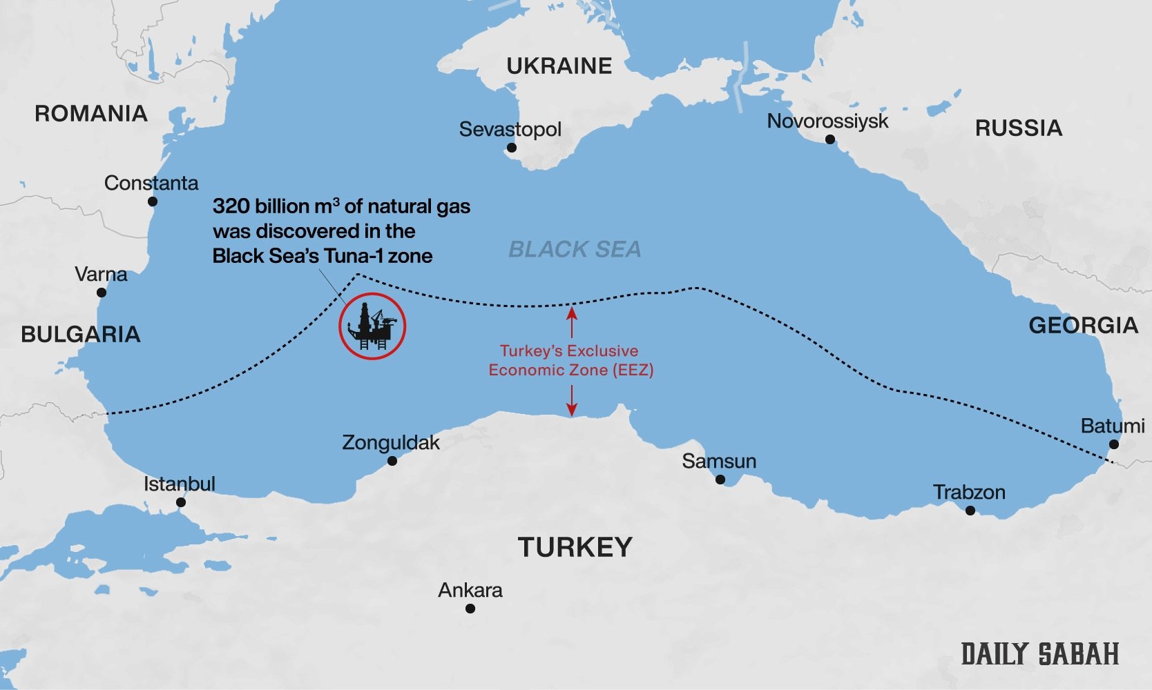 埃爾多安説,土耳其勘探船“忠誠”號在專屬經濟區(EEZ)內的“金槍魚1號”海區(已改名為薩卡里亞,Sakarya)發現了天然氣田。這裏距離沿岸約150公里,靠近與保加利亞、羅馬尼亞的海上邊界。