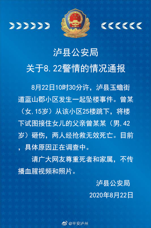 瀘州市公安局官方微博(@平安瀘州 )8月22日發佈警情通報:8月22日10時30分許,瀘縣玉蟾街道藍山郡小區發生一起墜樓事件。曾某(女,15歲)從該小區25樓跳下,將樓下試圖接住女兒的父親曾某某(男,42歲)砸傷,兩人經搶救無效死亡。目前具體原因正在調查中。