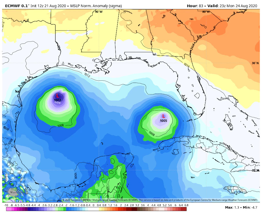 美國國家海洋和大氣管理局表示,兩個熱帶氣旋同時進入墨西哥灣的先例十分罕見,上一次還是在1933年。不過當時兩者相距甚遠,分別從美國沿岸的最西端(得州布朗斯維爾)與東端佛羅里達州登陸。
