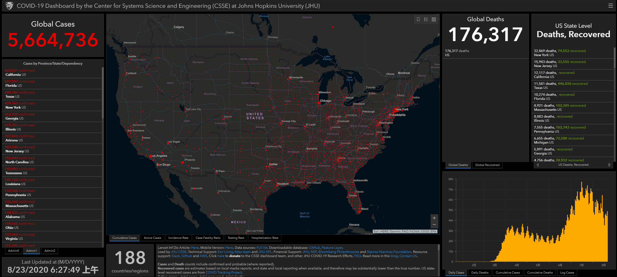 (觀察者網訊)根據美國約翰斯·霍普金斯大學8月23日實時數據,截至8月23日6時27分(美東時間8月22日18時27分),美國累計新冠確診病例達到5664736例,24小時新增47742例。累計死亡176317例,24小時新增1098例。